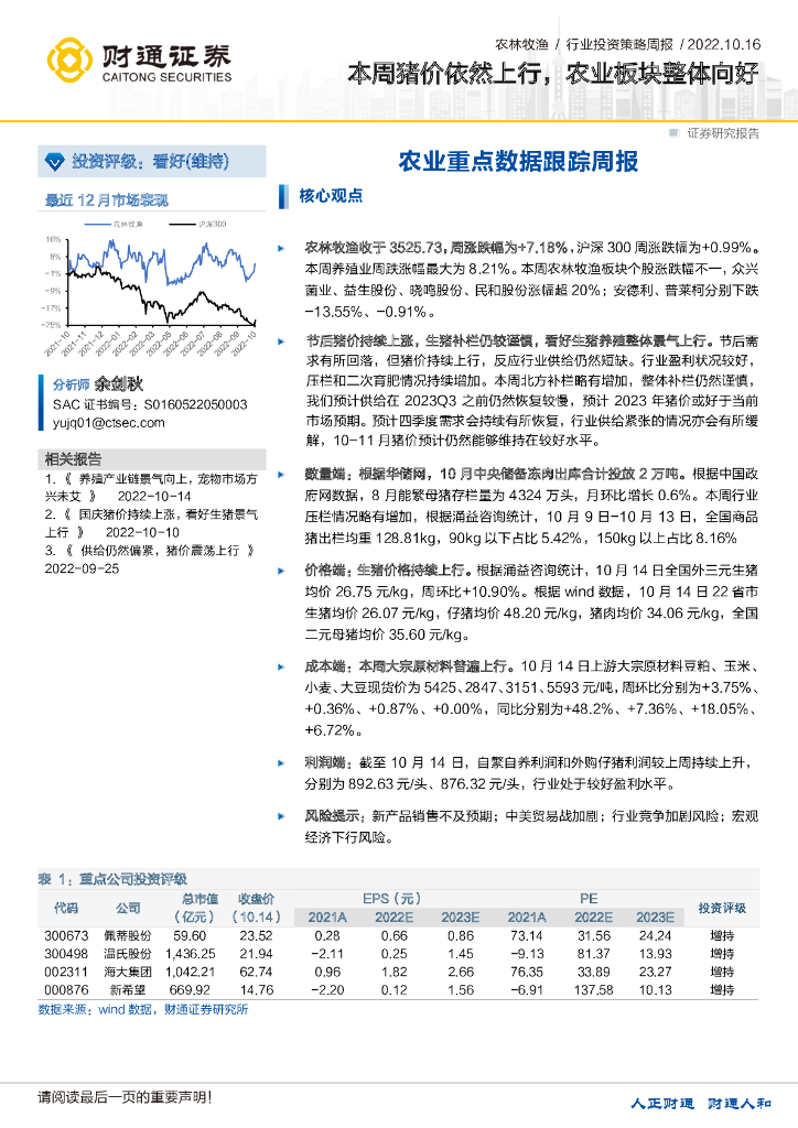 财通证券:农业重点数据跟踪周报:本周猪价依然上行,农业板块整体向好.pdf