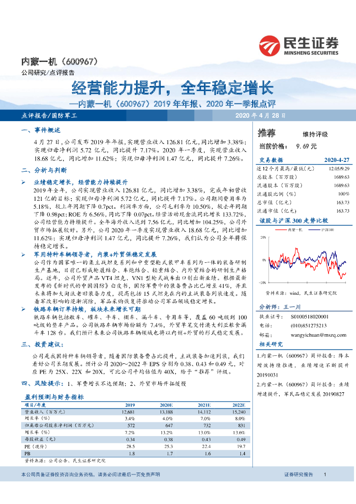 民生证券:内蒙一机(600967)-2019年年报、2020年一季报点评:经营能力提升,全年稳定增长.pdf