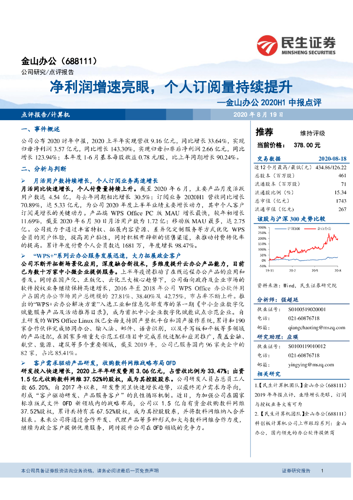 民生证券:金山办公(688111)-2020H1中报点评:净利润增速亮眼,个人订阅量持续提升.pdf
