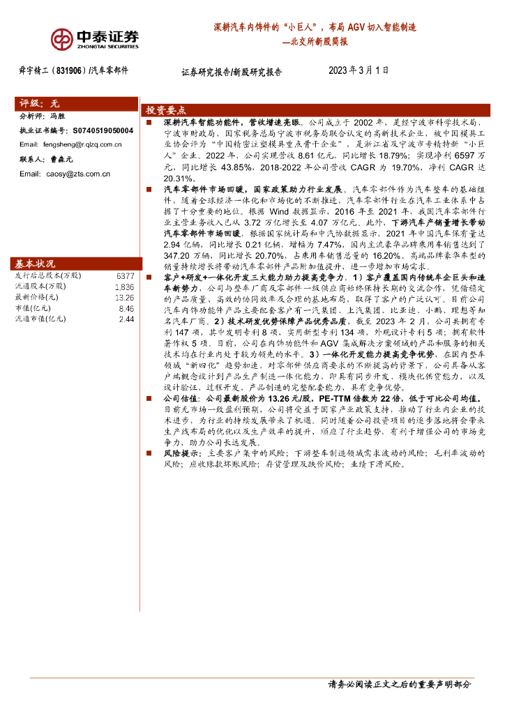 中泰证券:舜宇精工(831906)-北交所新股简报:深耕汽车内饰件的“小巨人”,布局AGV切入智能制造.pdf