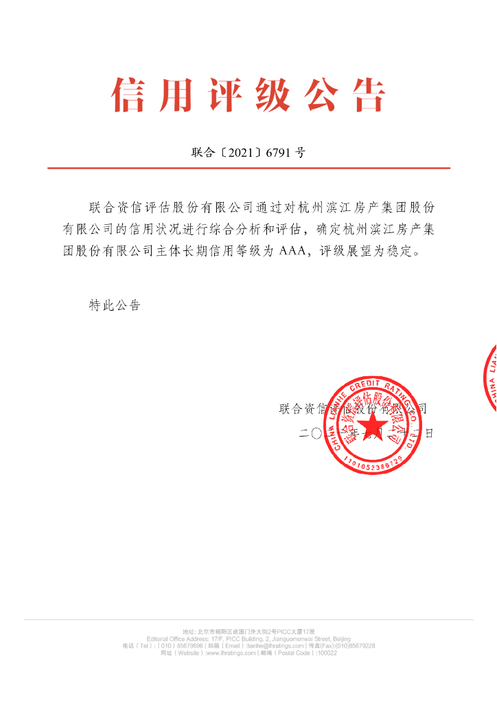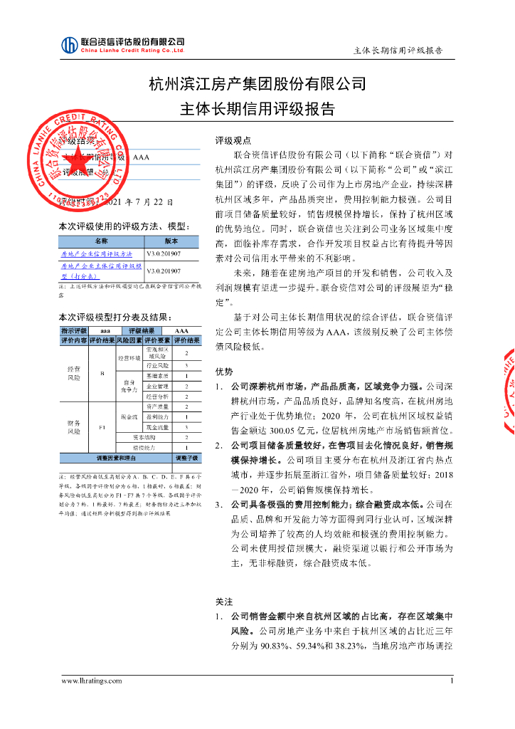联合资信:杭州滨江房产集团股份有限公司主体评级报告及跟踪评级安排.pdf