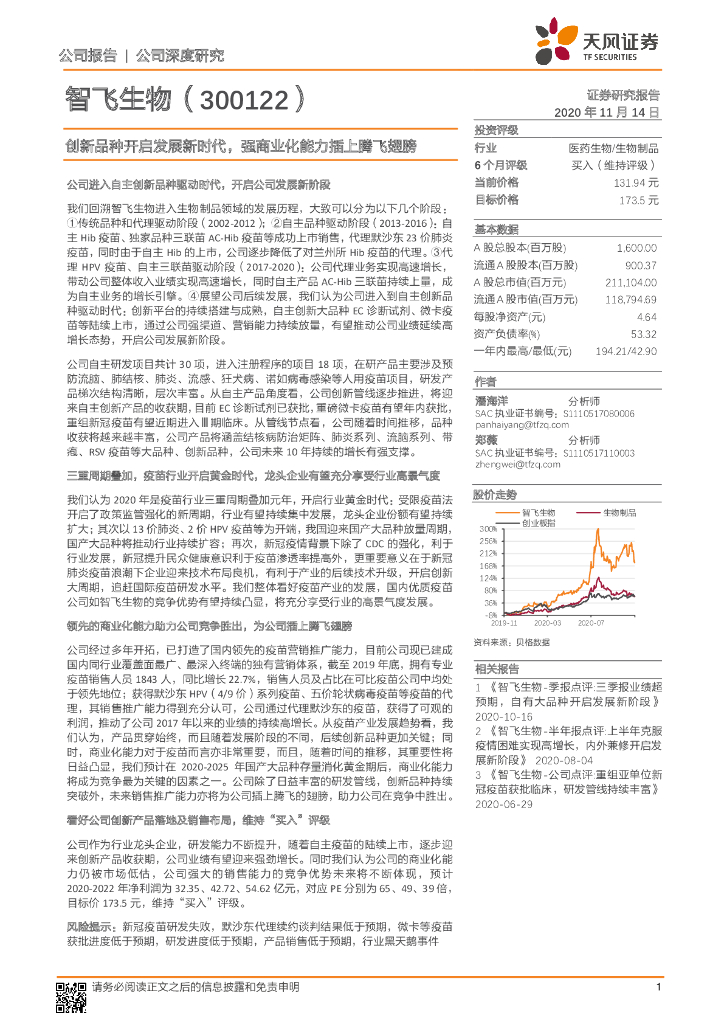 天风证券:智飞生物(300122)-创新品种开启发展新时代,强商业化能力插上腾飞翅膀.pdf