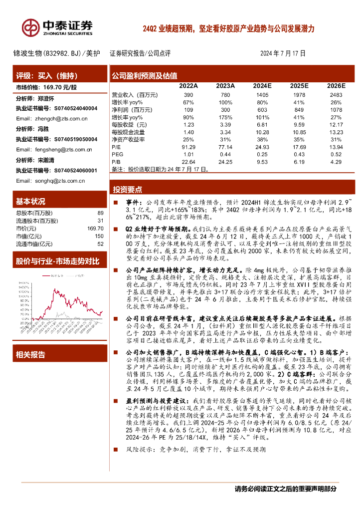 中泰证券:锦波生物(832982)-24Q2业绩超预期,坚定看好胶原产业趋势与公司发展潜力.pdf