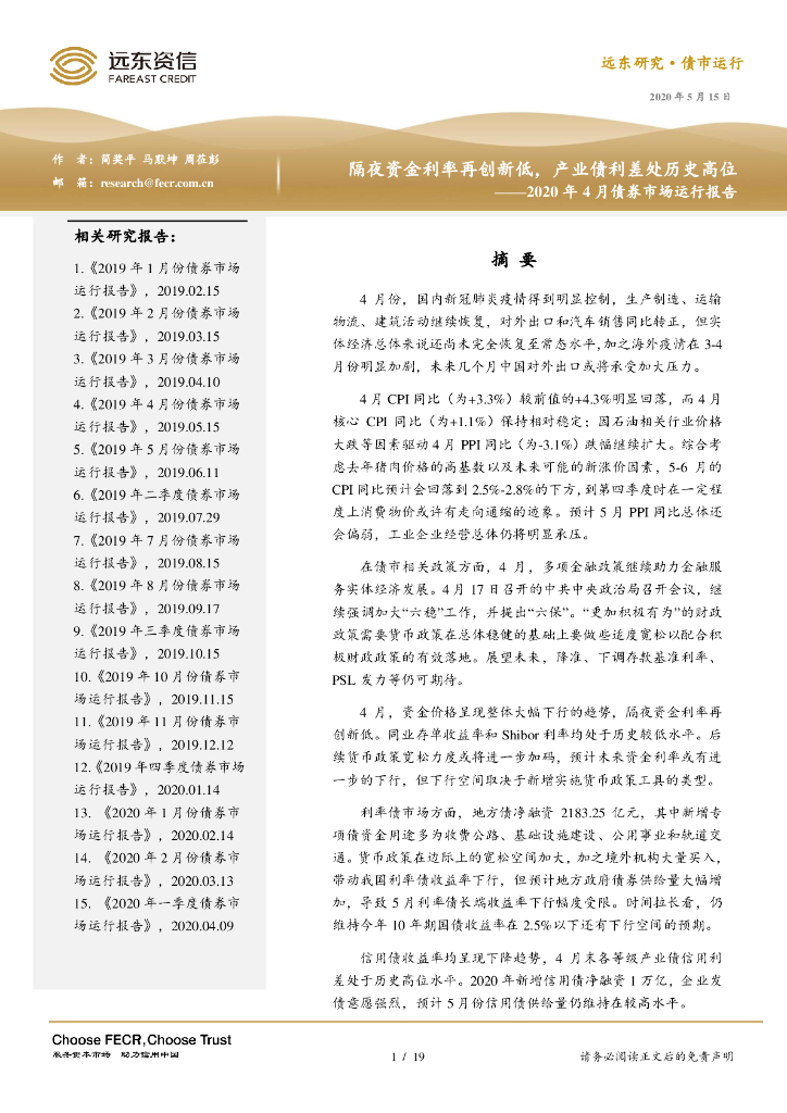 远东资信:2020年4月债券市场运行报告:隔夜资金利率再创新低,产业债利差处历史高位.pdf