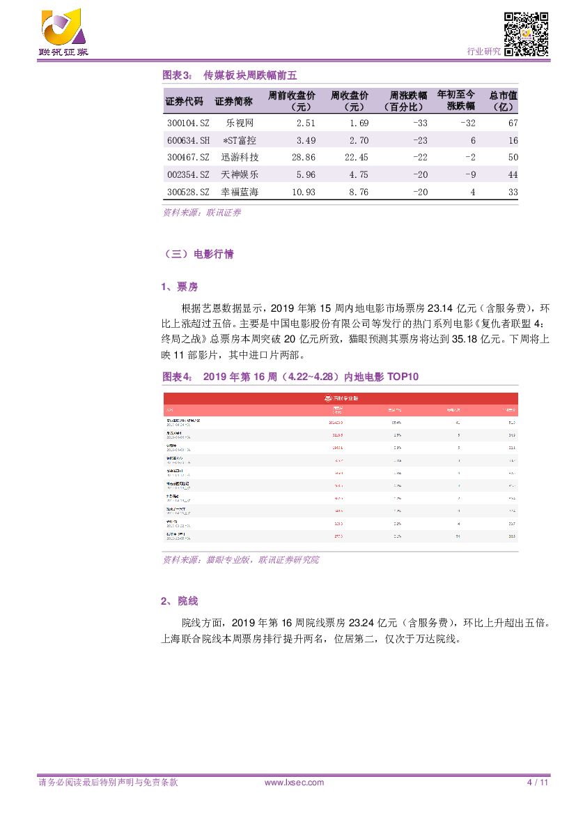 联讯证券:【联讯传媒周报】注意《复联4》产业链相关标的阶段性获利回吐,与市场调整期布局中长线具性价比之标的.pdf