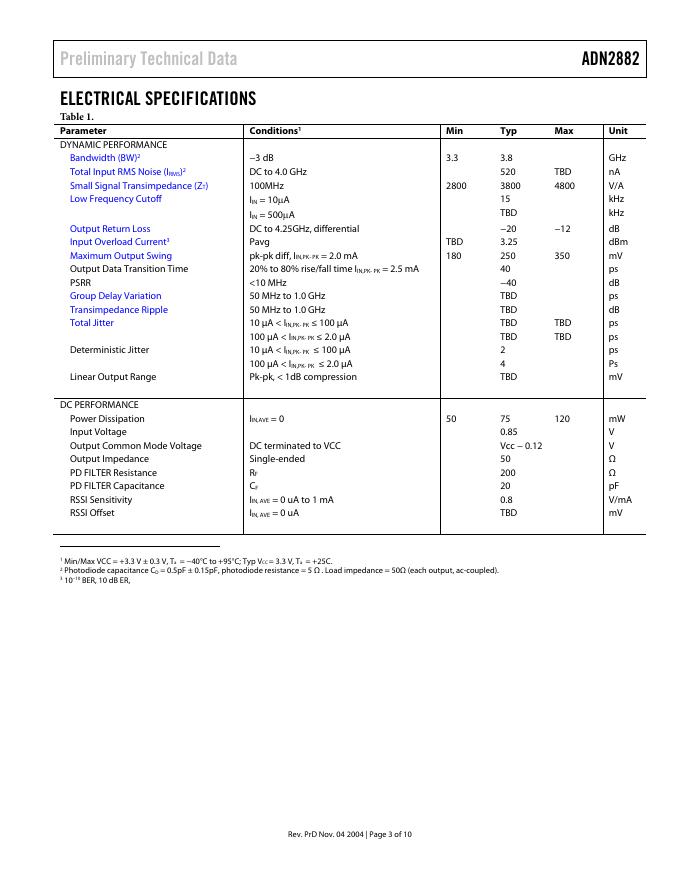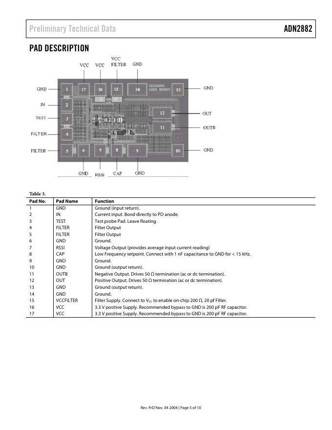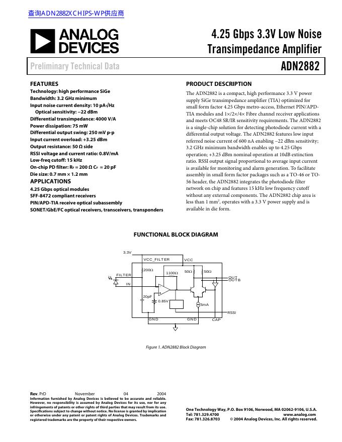 ANALOG DEVICES ADN2882 4.25 Gbps 3.3V Low Noise Transimpedance Amplifier 数据手册.pdf