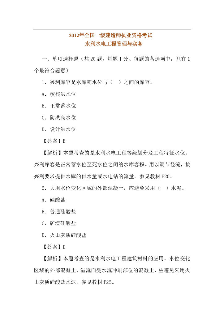 2012年一级建造师水利水电实务真题(附答案).pdf