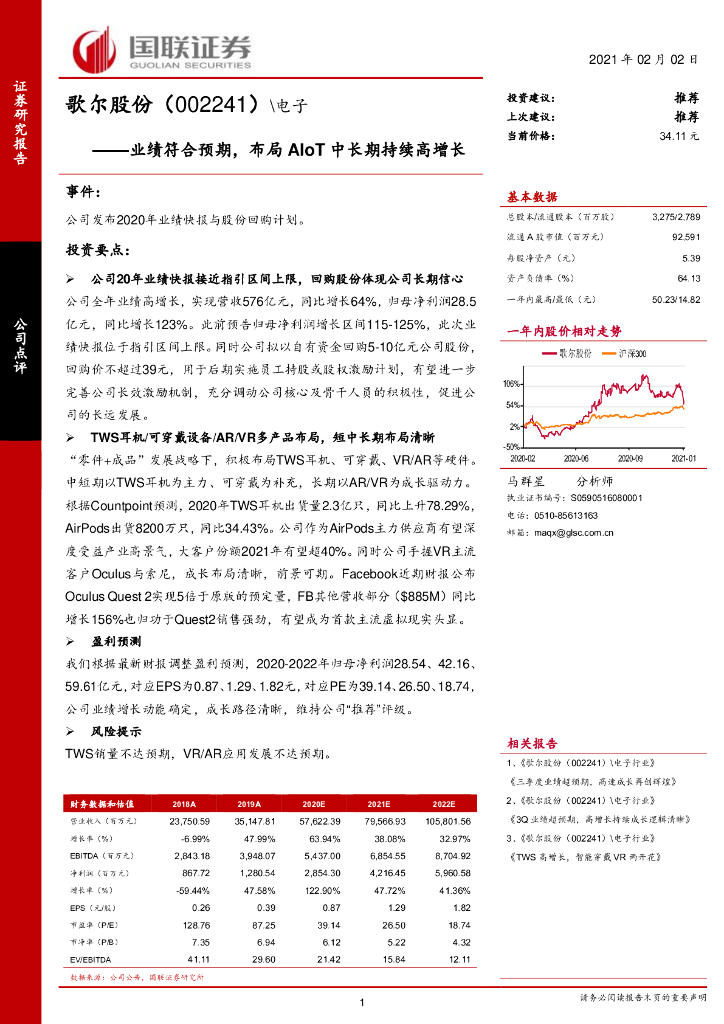 国联证券:歌尔股份(002241)-业绩符合预期,布局AIoT中长期持续高增长.pdf