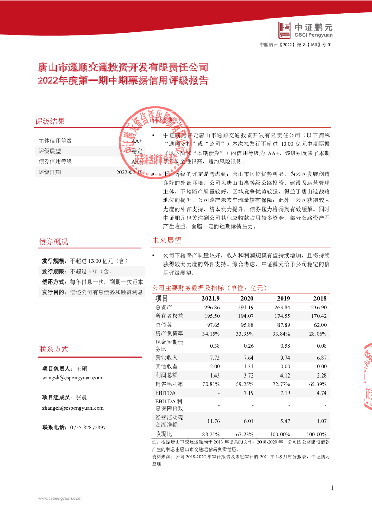 鹏元:唐山市通顺交通投资开发有限责任公司2022年度第一期中期票据信用评级报告.pdf
