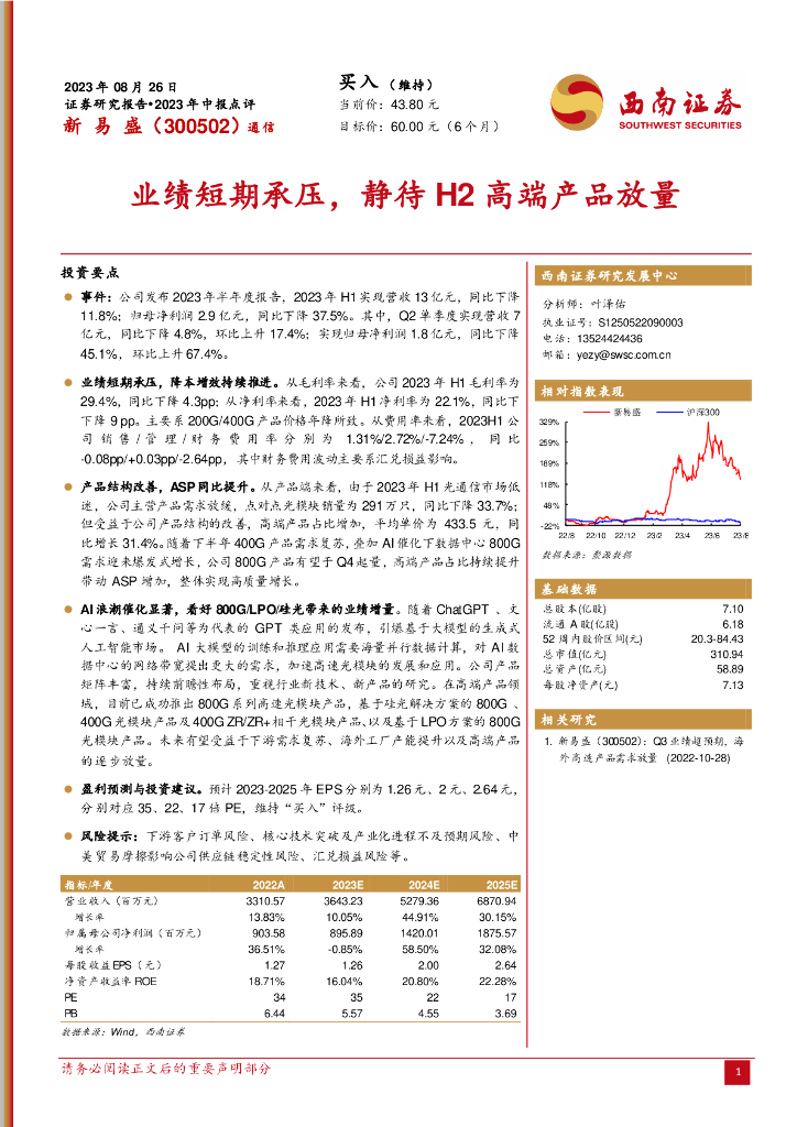 西南证券:新易盛(300502)-业绩短期承压,静待H2高端产品放量.pdf