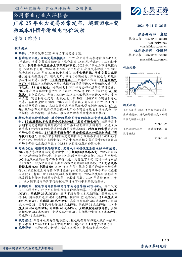 东吴证券:公用事业行业点评报告:广东25年电力交易方案发布,超额回收+变动成本补偿平滑核电电价波动.pdf