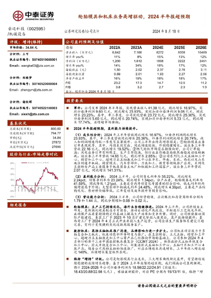 中泰证券:豪迈科技(002595)-轮胎模具和机床业务高增驱动,2024半年报超预期.pdf