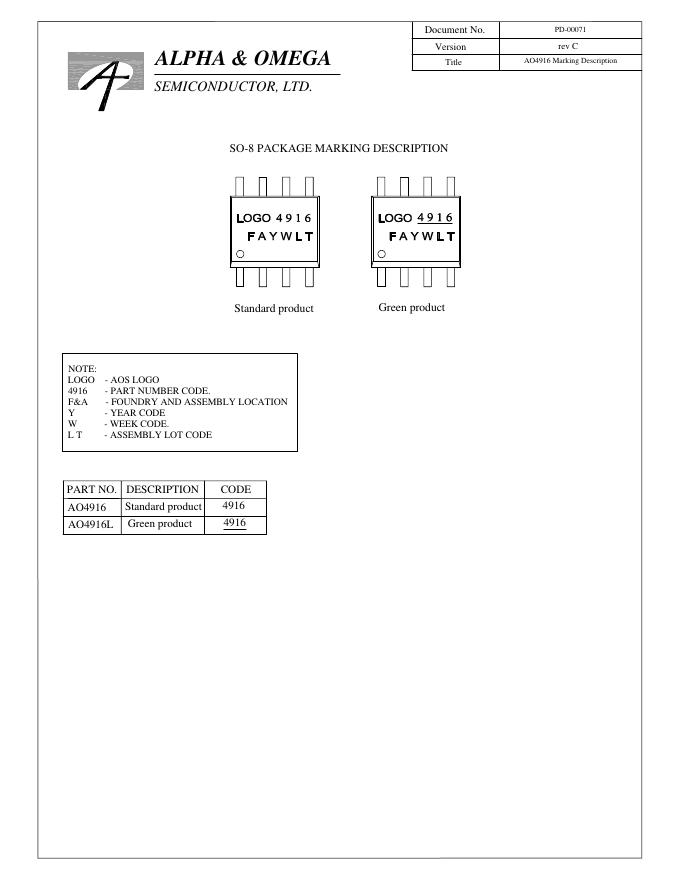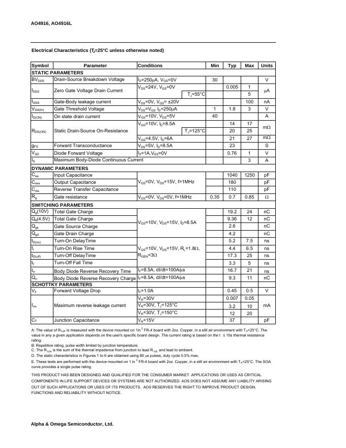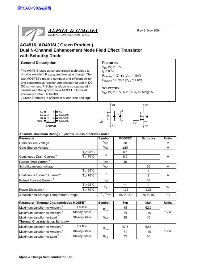 ALPHA&OMEGA AO4916, AO4916L( Green Product ) Dual N-Channel Enhancement Mode Field Effect Transistor with Schottky Diode 数据手册.pdf