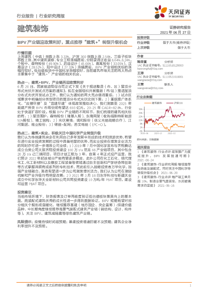 天风证券:建筑装饰行业研究周报:BIPV产业链迎政策利好,重点推荐“建筑+”转型升级机会.pdf