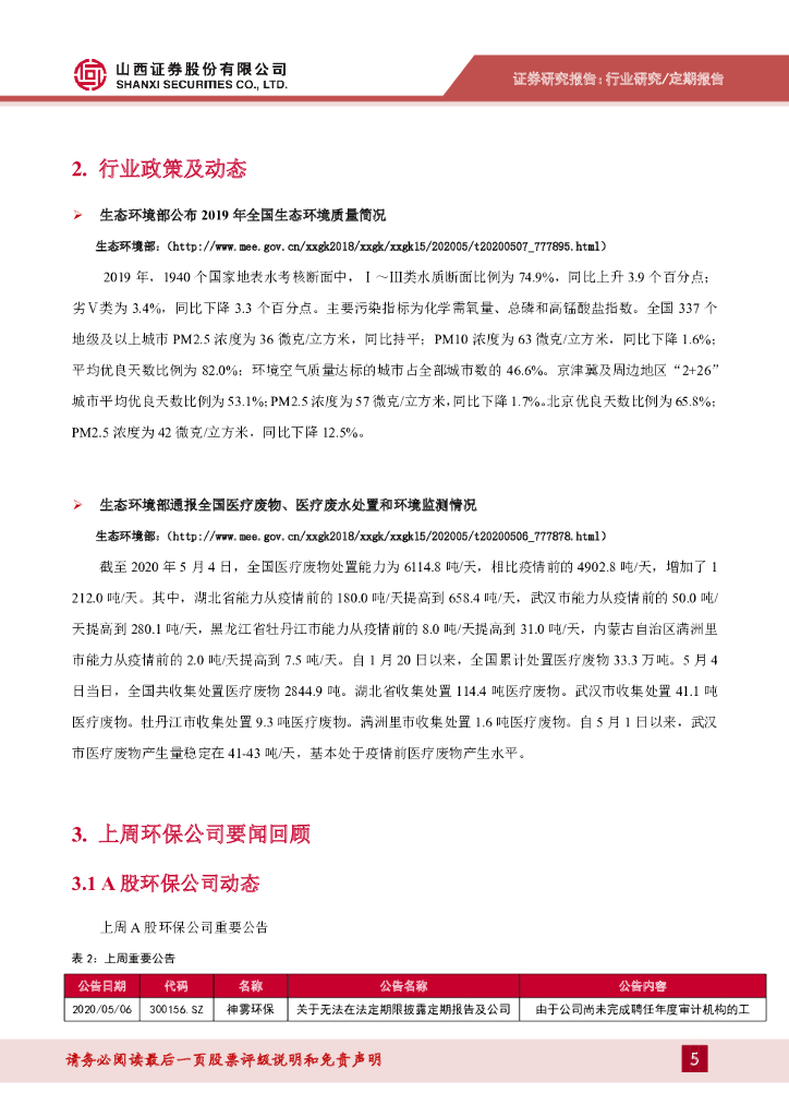 山西证券:环保(含新三板)行业周报:生态环境部公布2019年全国生态环境质量简况.pdf