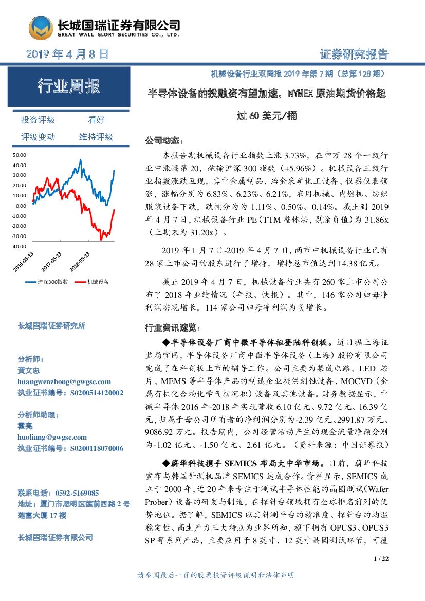 长城国瑞证券:机械设备行业双周报2019年第7期(总第128期):半导体设备的投融资有望加速,NYMEX原油期货价格超过60美元/桶.pdf