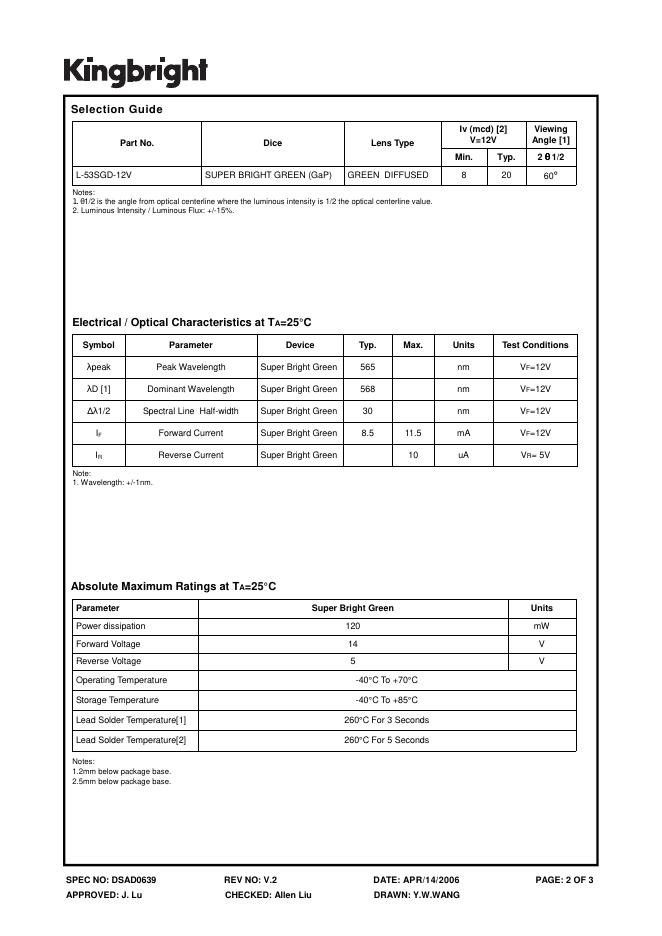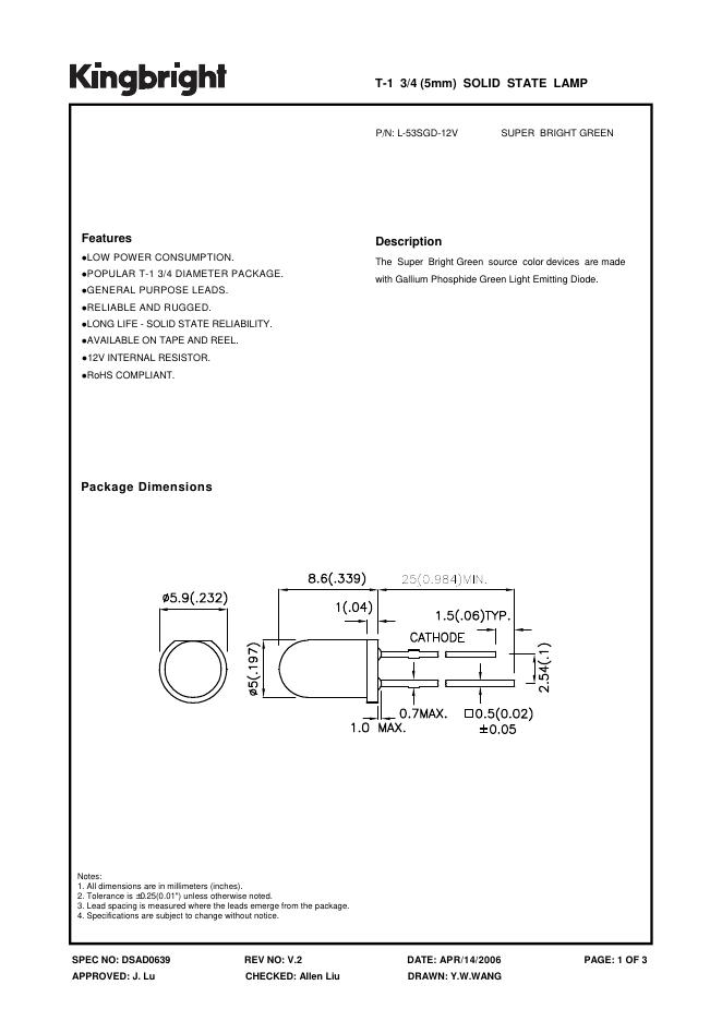 KINGBRIGHT - SPEC NO: DSAD0639 REV NO: V.2 T-1 3/4 (5mm) SOLID STATE LAM 数据手册.pdf