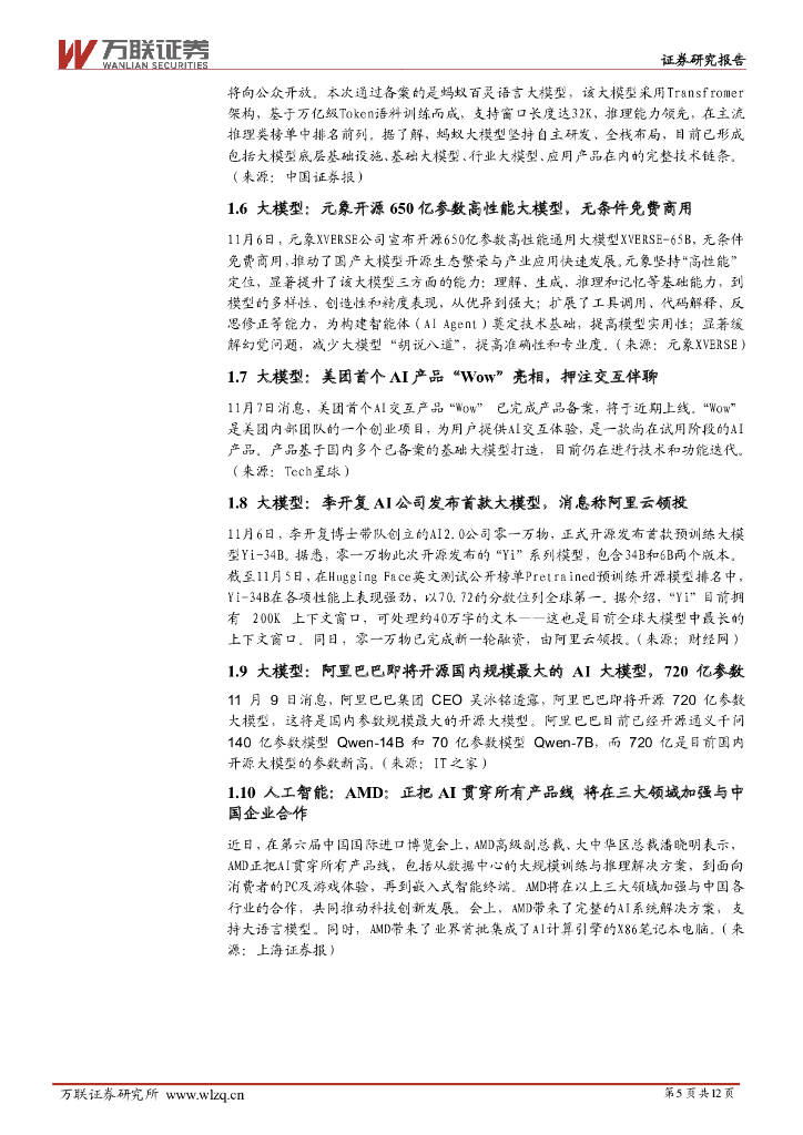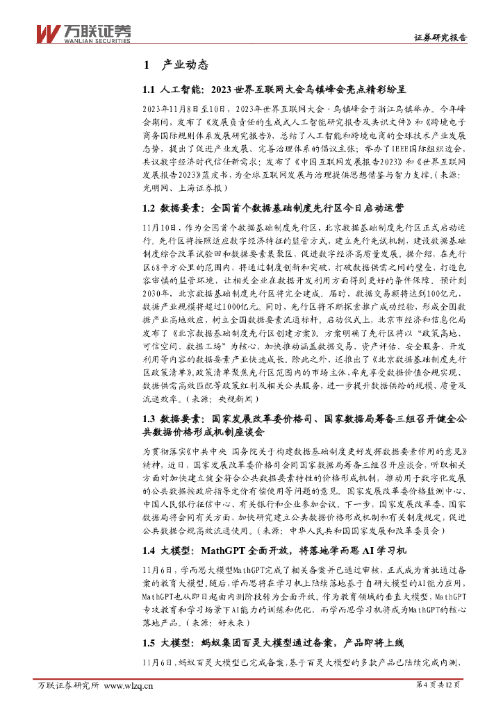 万联证券:计算机行业周观点:互联网大会乌镇峰会亮点纷呈,多个大模型相继发布.pdf