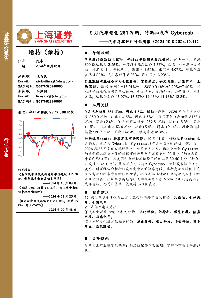上海证券:汽车与零部件行业周报:9月汽车销量281万辆,特斯拉发布Cybercab.pdf