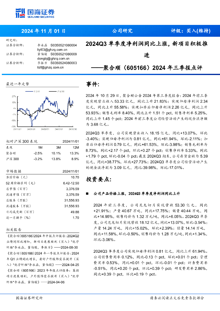 国海证券:聚合顺(605166)-2024年三季报点评:2024Q3单季度净利润同比上涨,新项目积极推进.pdf