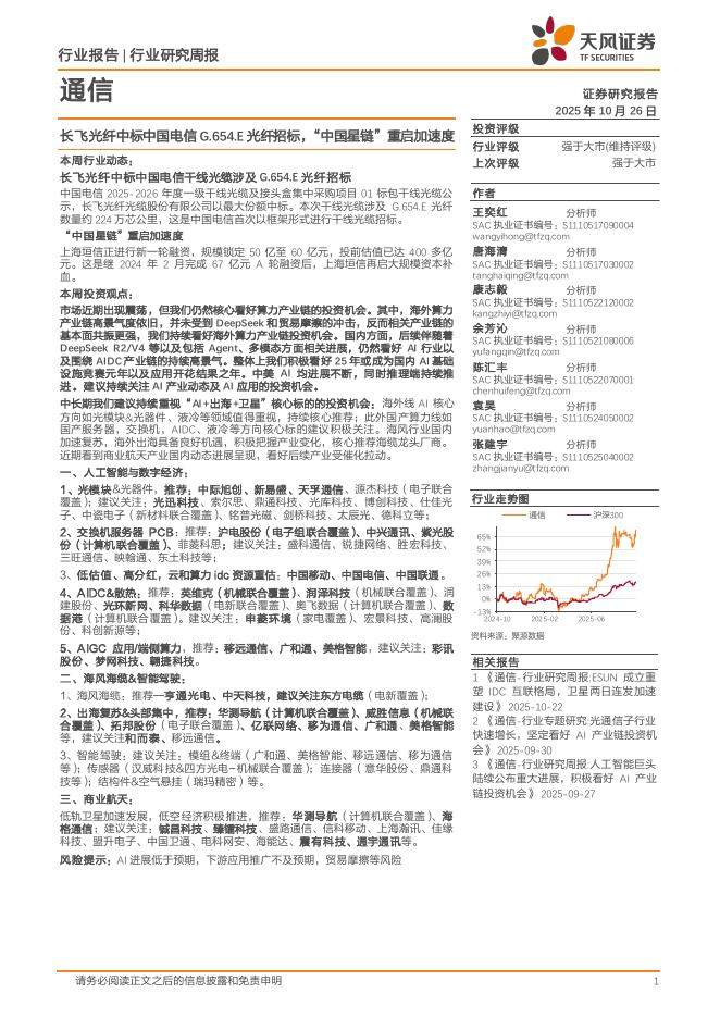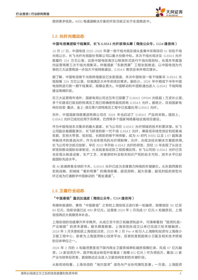 天风证券:通信行业研究周报:长飞光纤中标中国电信G.654.E光纤招标,“中国星链”重启加速度.pdf
