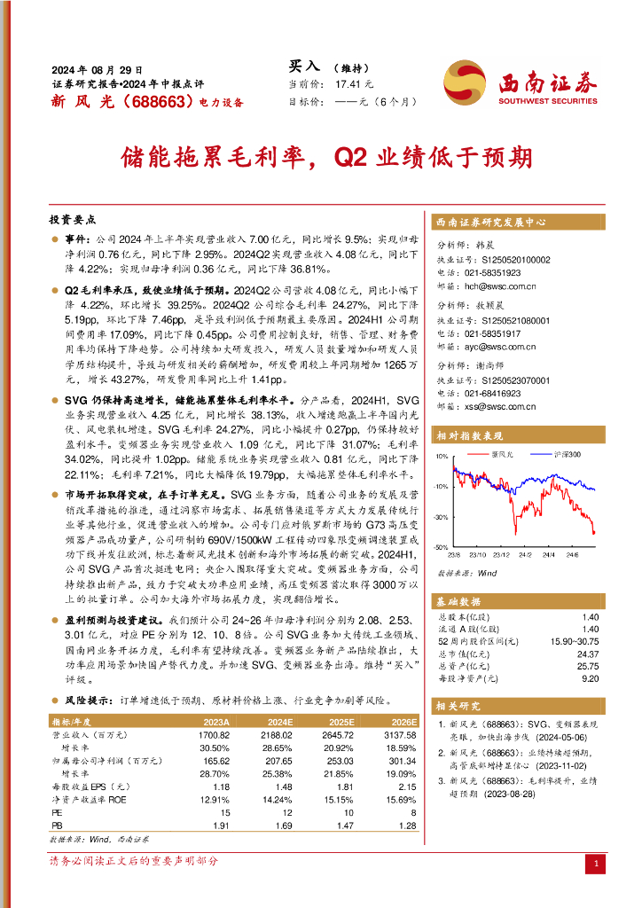 西南证券:新风光(688663)-2024年中报点评:储能拖累毛利率,Q2业绩低于预期.pdf