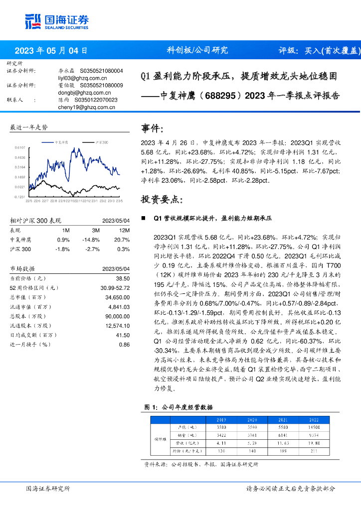 国海证券:中复神鹰(688295)-2023年一季报点评报告:Q1盈利能力阶段承压,提质增效龙头地位稳固.pdf