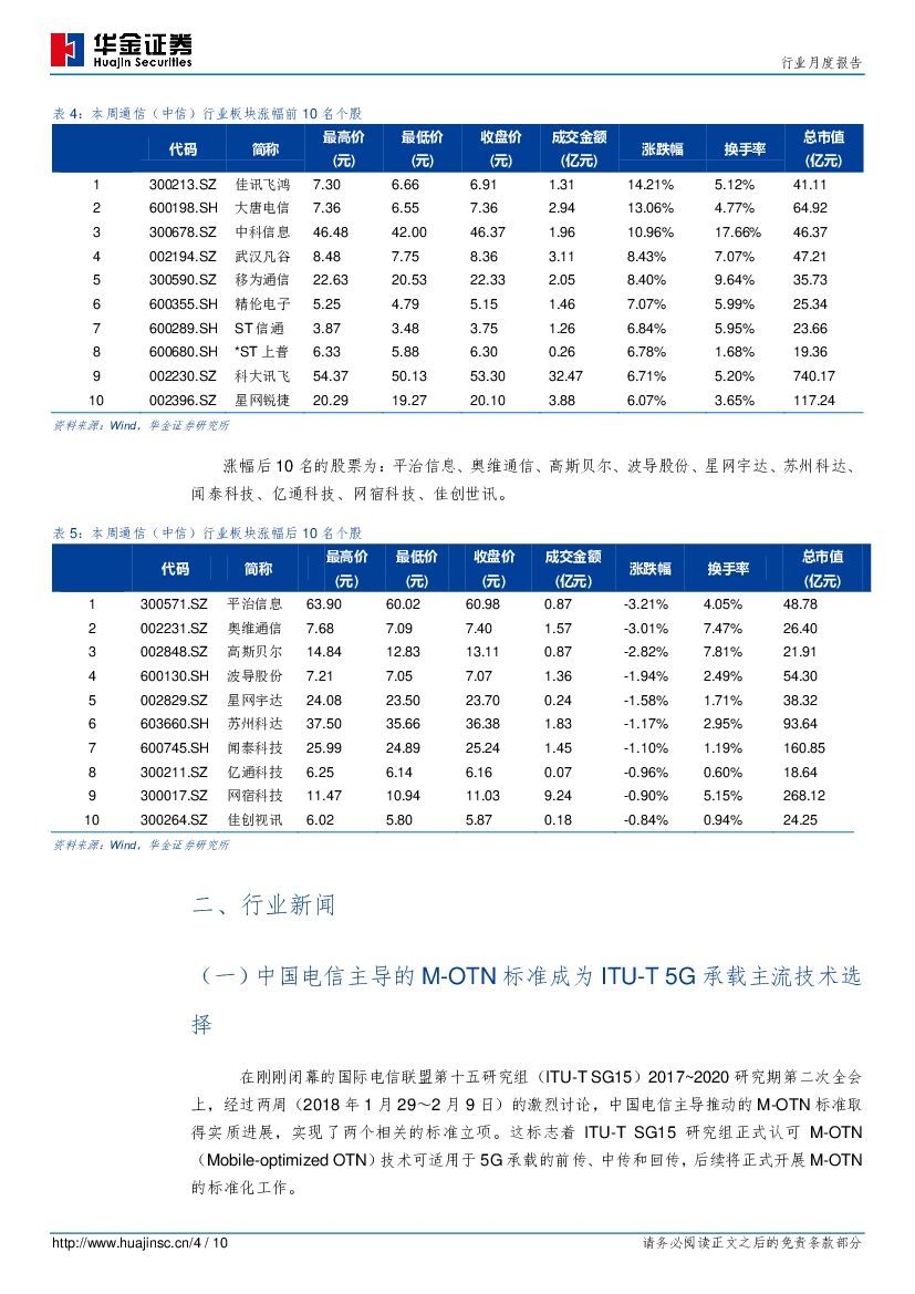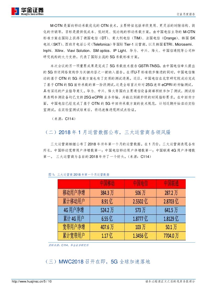 华金证券:通信行业周度报告:中国电信主导M-OTN标准成为ITU-T 5G承载主流技术选择,MWC2018召开在即.pdf