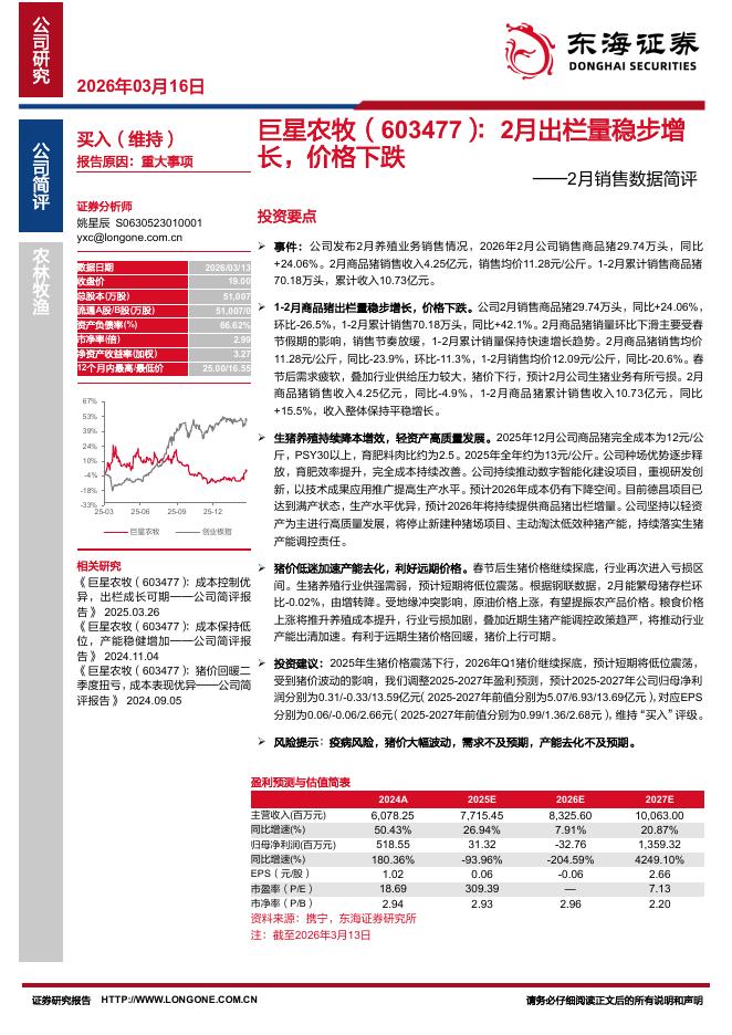 东海证券:巨星农牧(603477)-2月销售数据简评:2月出栏量稳步增长,价格下跌.pdf