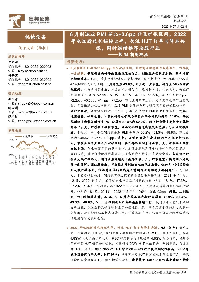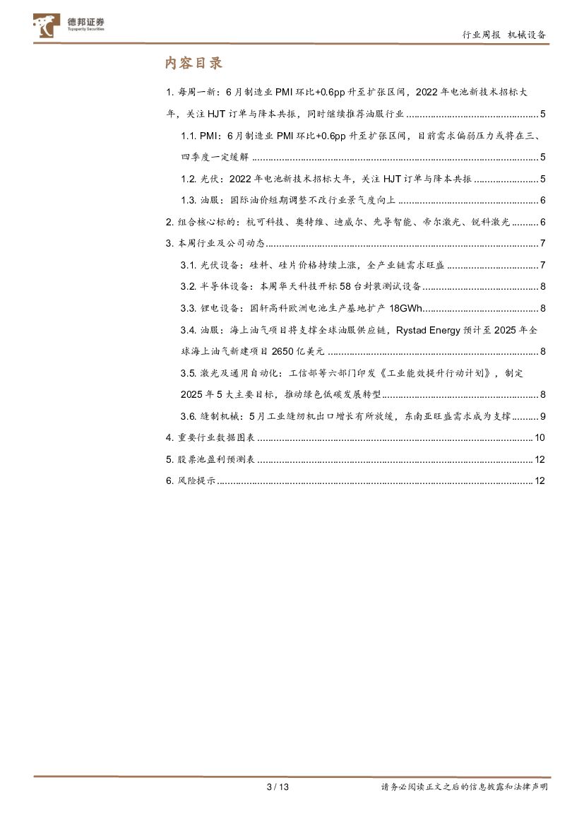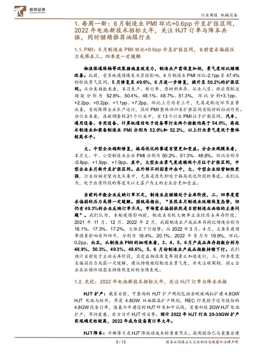 德邦证券:机械设备行业第34期周观点:6月制造业PMI环比+0.6pp升至扩张区间,2022年电池新技术招标大年,关注HJT订单与降本共振,同时继续推荐油服行业.pdf