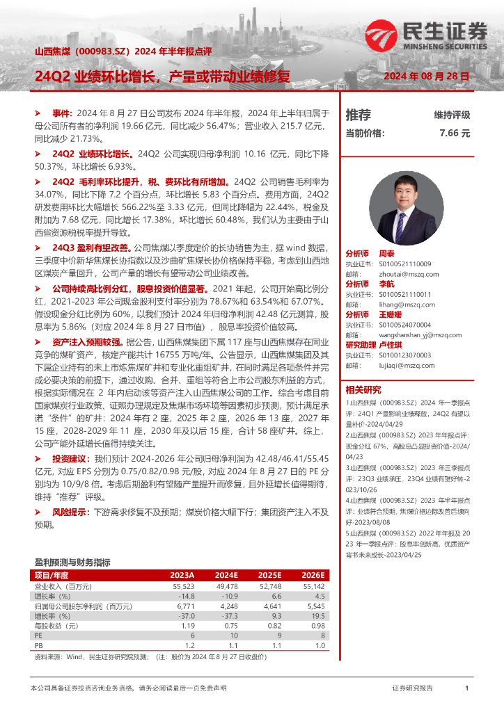 民生证券:山西焦煤(000983)-2024年半年报点评:24Q2业绩环比增长,产量或带动业绩修复.pdf