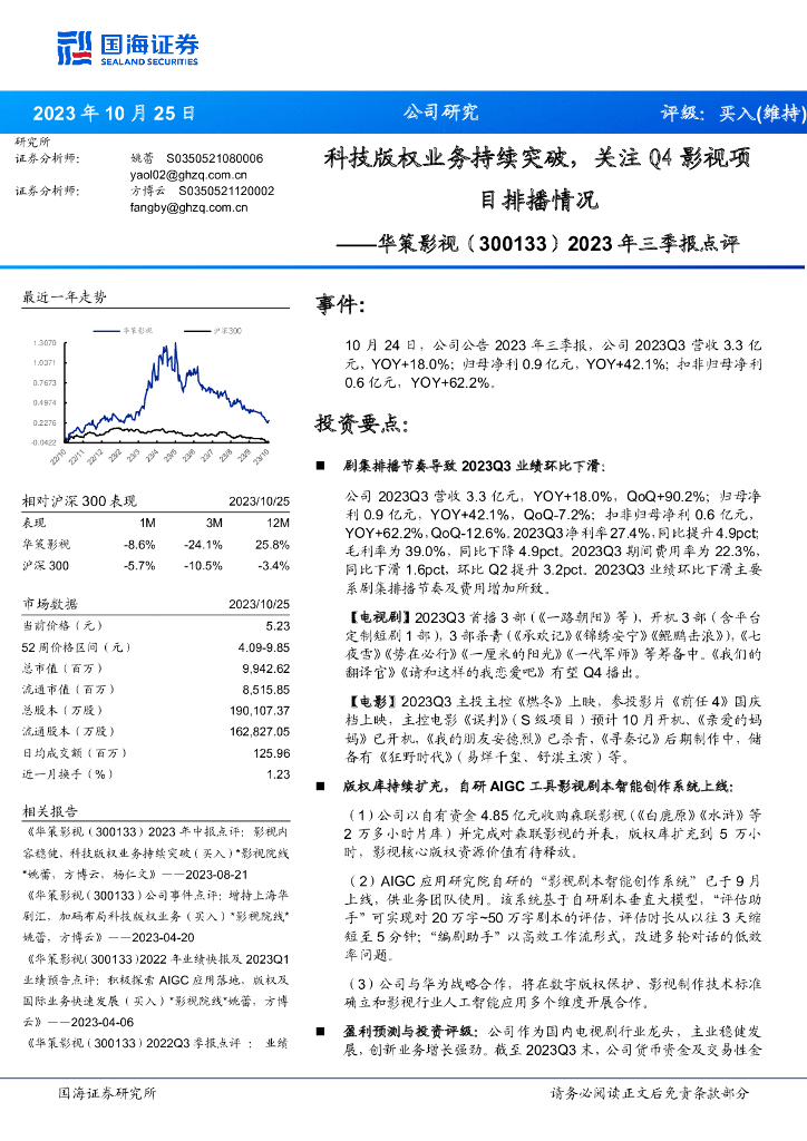 国海证券:华策影视(300133)-2023年三季报点评:科技版权业务持续突破,关注Q4影视项目排播情况*影视院线*姚蕾.pdf