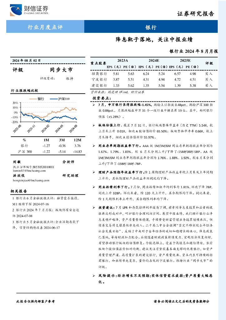 财信证券:银行业2024年8月月报:降息靴子落地,关注中报业绩.pdf