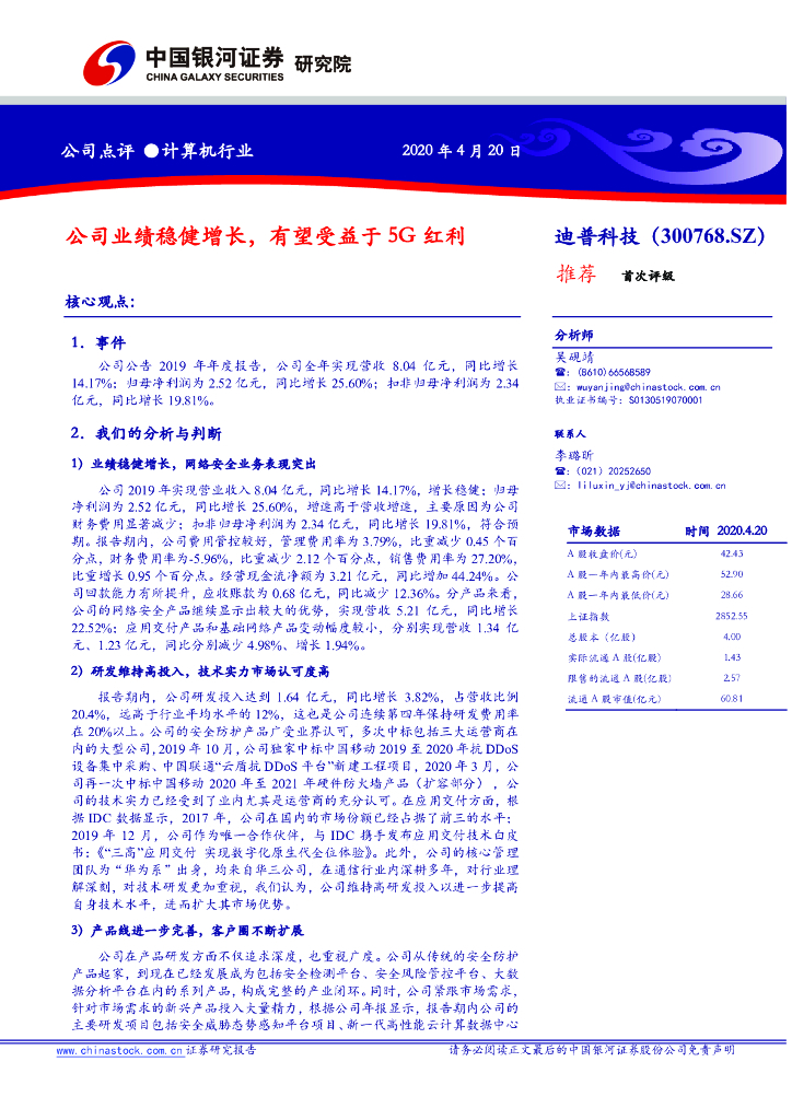 中国银河:迪普科技(300768)-公司业绩稳健增长,有望受益于5G红利.pdf