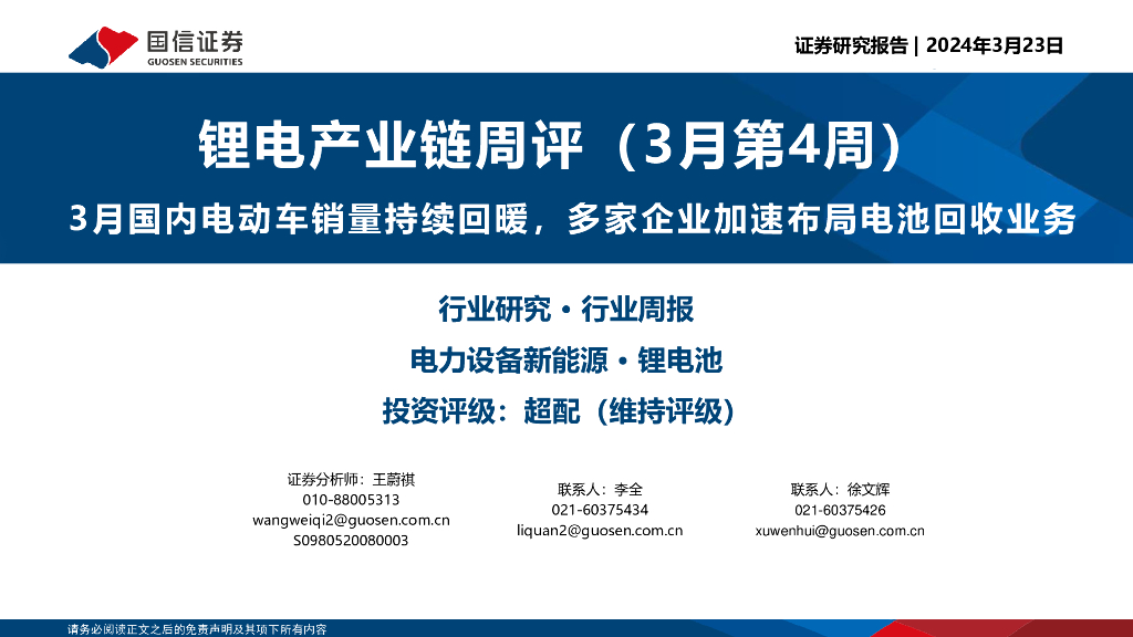 国信证券:锂电产业链周评(3月第4周):3月国内电动车销量持续回暖,多家企业加速布局电池回收业务.pdf