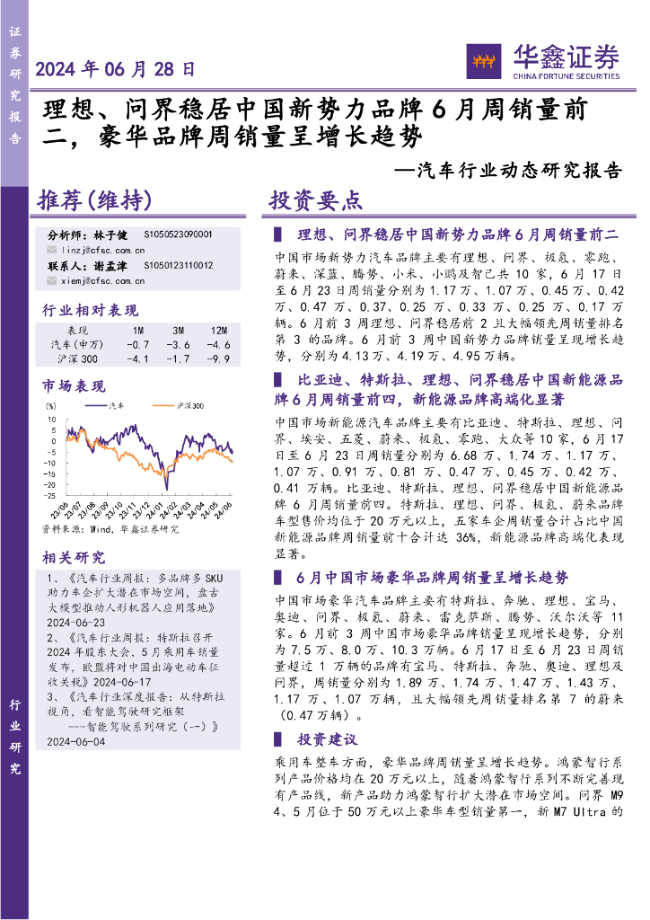 华鑫证券:汽车行业动态研究报告:理想、问界稳居中国新势力品牌6月周销量前二,豪华品牌周销量呈增长趋势.pdf