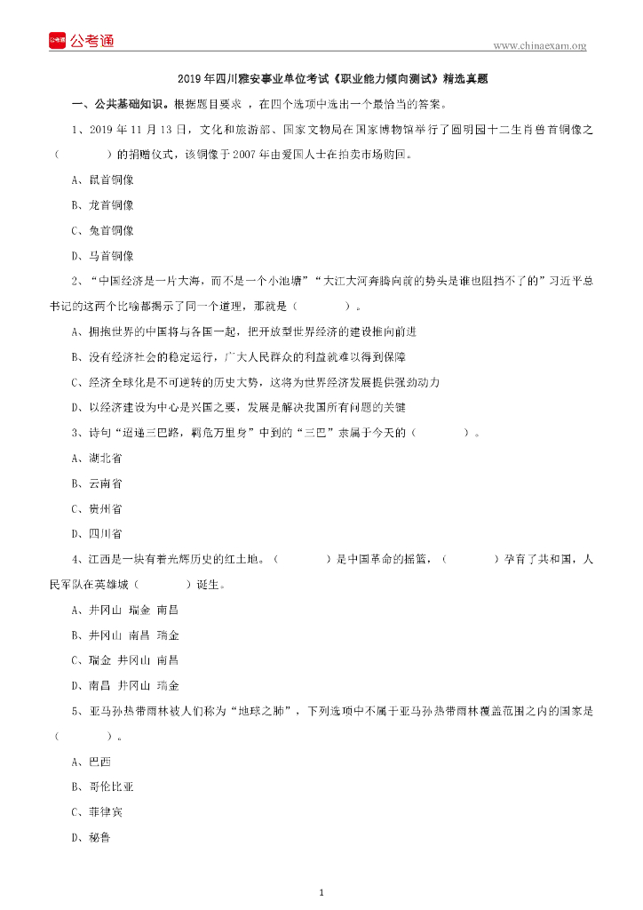 2019年四川雅安事业单位考试《职业能力倾向测试》精选真题.pdf