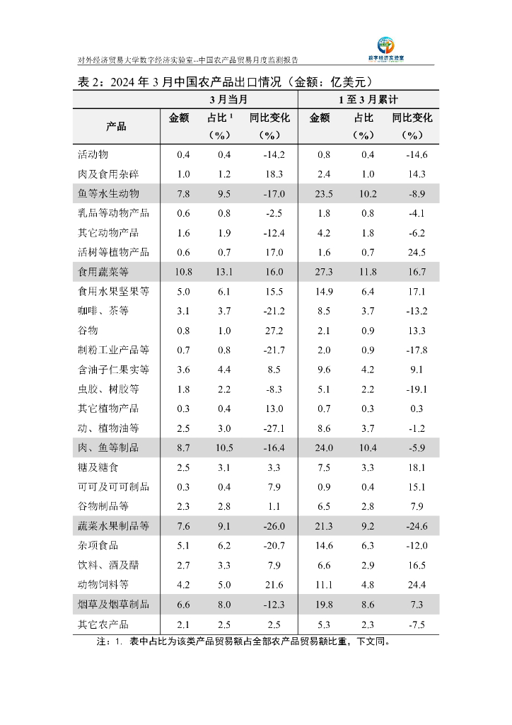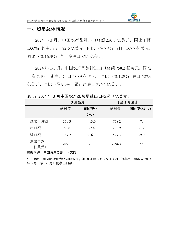 对外经济贸易大学:中国农产品贸易月度监测报告(2024年1-3月).pdf