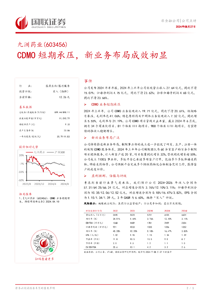 国联证券:九洲药业(603456)-CDMO短期承压,新业务布局成效初显.pdf