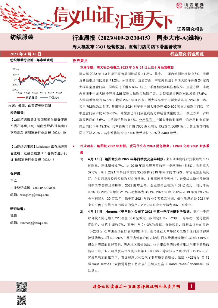 山西证券:纺织服装行业周报:周大福发布23Q1经营数据,直营门店同店下滑显著收窄.pdf
