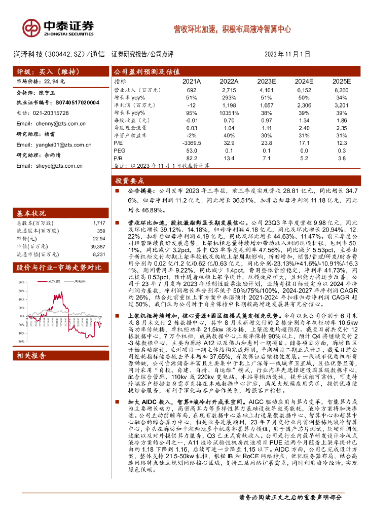 中泰证券:润泽科技(300442)-营收环比加速,积极布局液冷智算中心.pdf