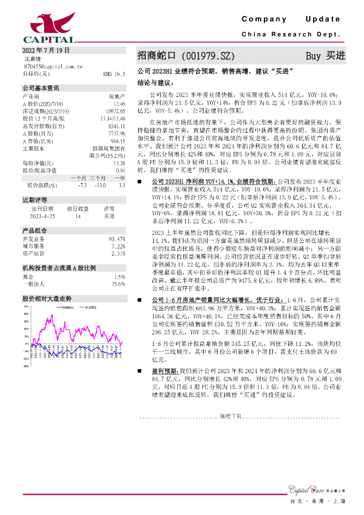 群益证券:招商蛇口(001979)-公司2023H1业绩符合预期,销售高增,建议“买进”.pdf