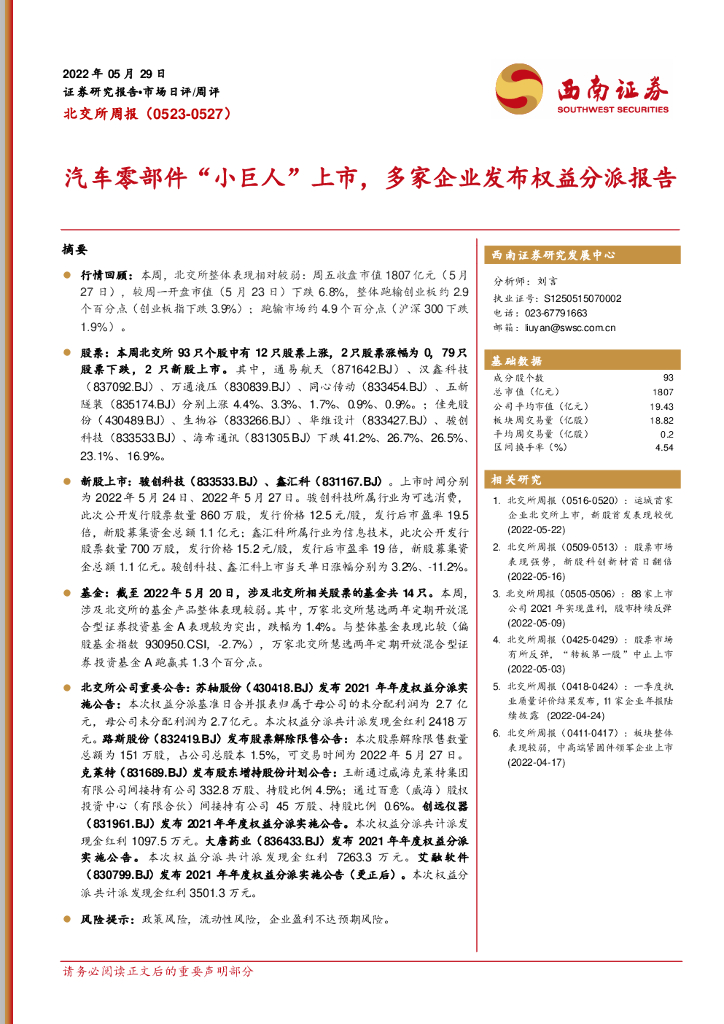 西南证券:北交所周报:汽车零部件“小巨人”上市,多家企业发布权益分派报告.pdf