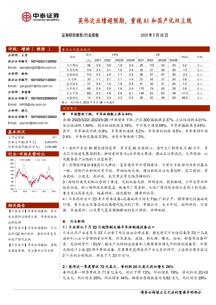 中泰证券:电子行业周报:英伟达业绩超预期,重视AI和国产化双主线.pdf