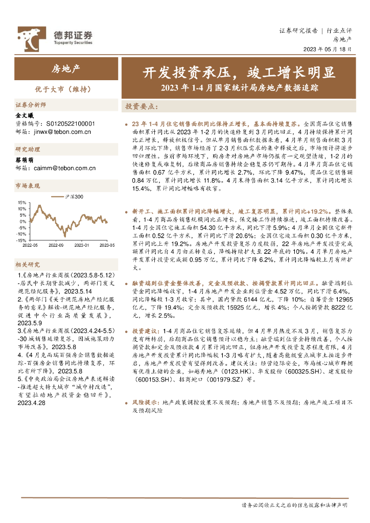 德邦证券:2023年1-4月国家统计局房地产数据追踪:开发投资承压,竣工增长明显.pdf