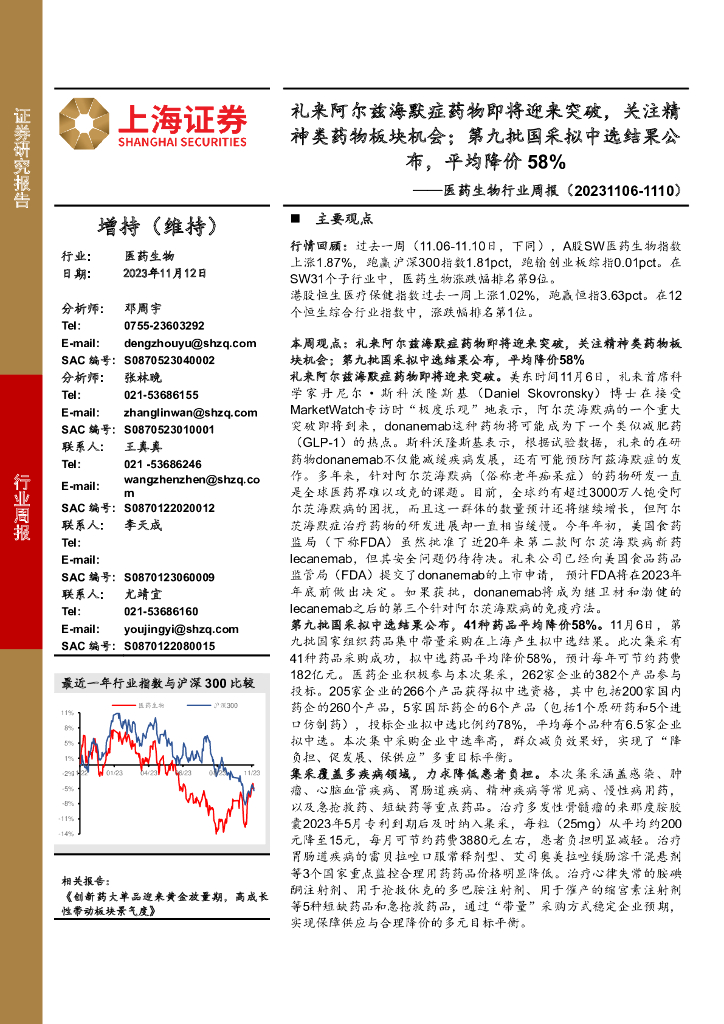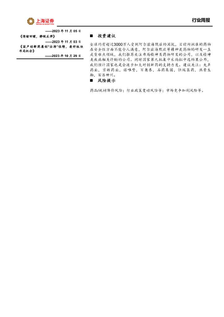 上海证券:医药生物行业周报:礼来阿尔兹海默症药物即将迎来突破,关注精神类药物板块机会;第九批国采拟中选结果公布,平均降价58%.pdf