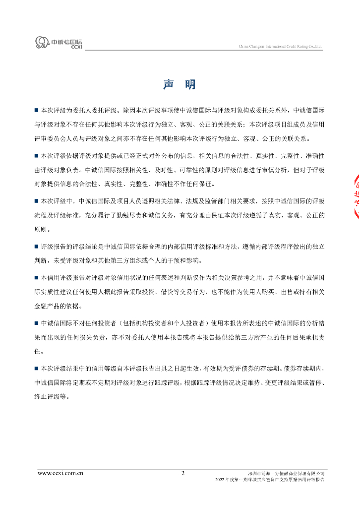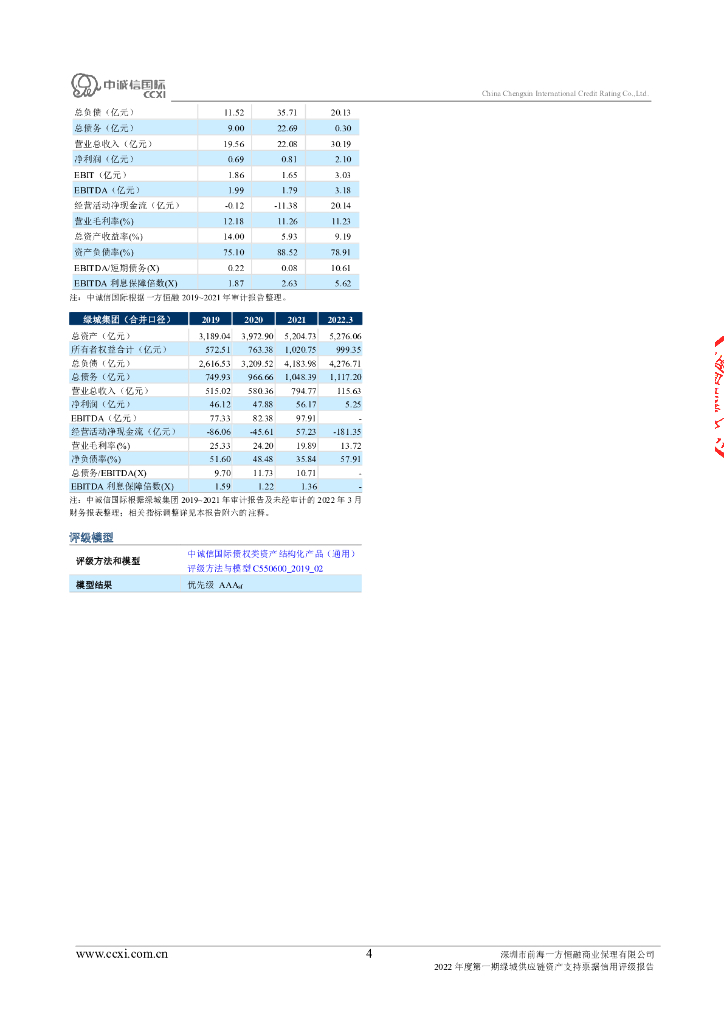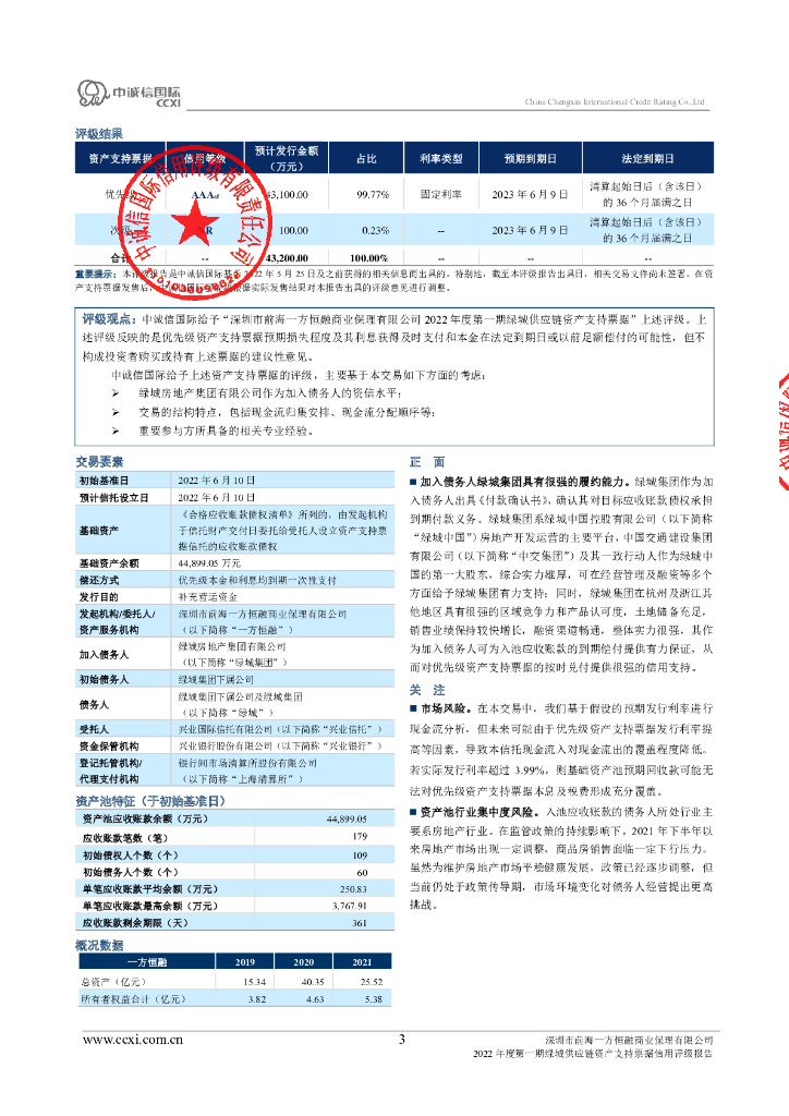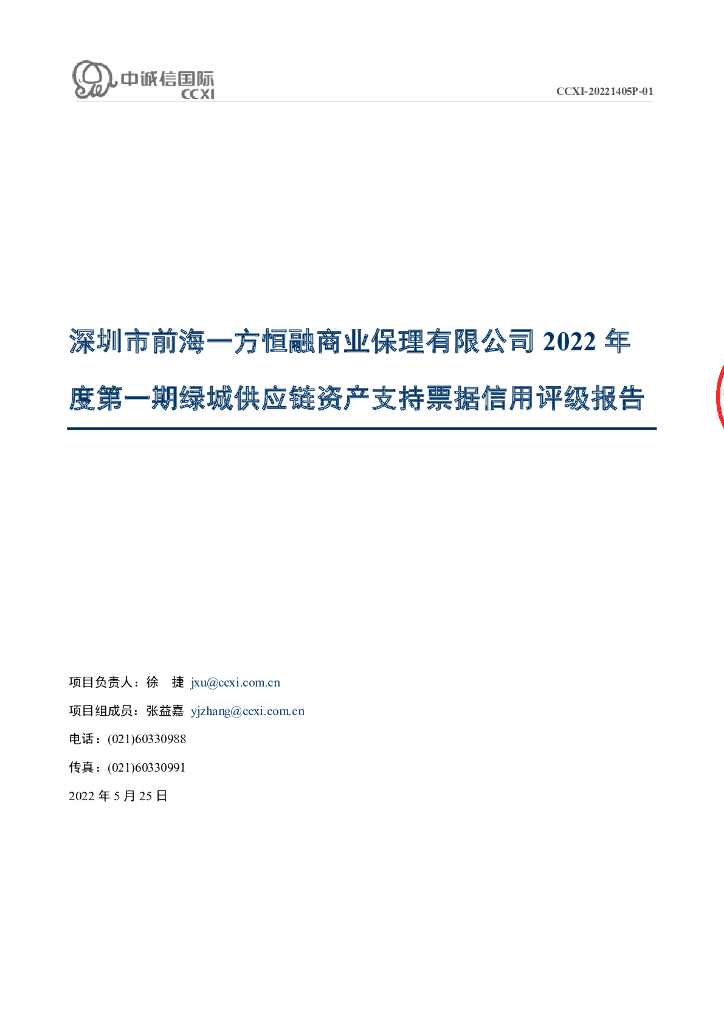 中诚信:深圳市前海一方恒融商业保理有限公司2022年度第一期绿城供应链资产支持票据信用评级报告.pdf