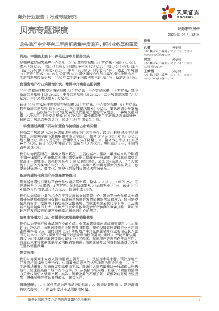 天风证券:房地产:贝壳专题深度-龙头地产中介平台二手房新房集中度提升,新兴业务厚积薄发.pdf