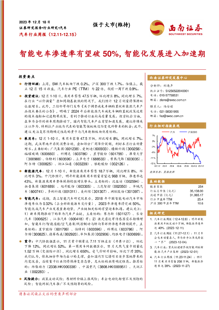 西南证券:汽车行业周报:智能电车渗透率有望破50%,智能化发展进入加速期.pdf