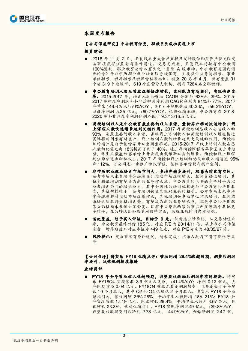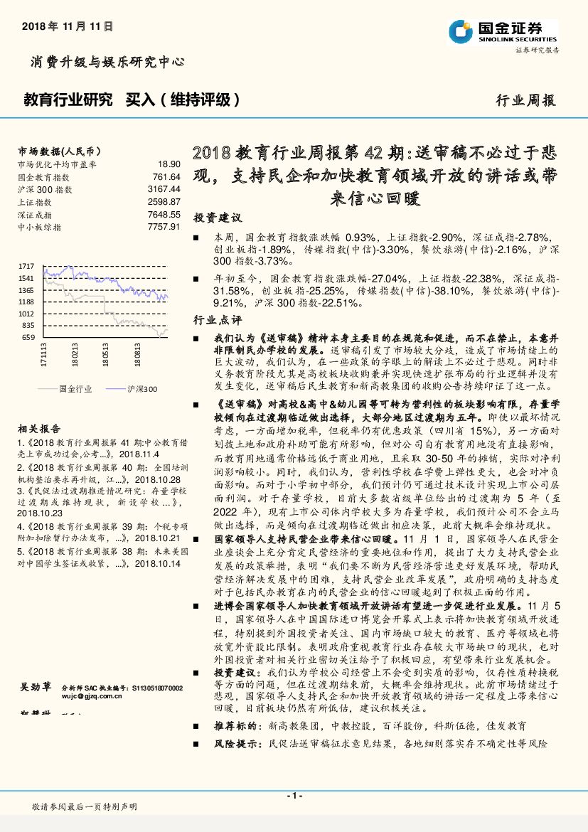 国金证券:2018教育行业周报第42期:送审稿不必过于悲观,支持民企和加快教育领域开放的讲话或带来信心回暖.pdf